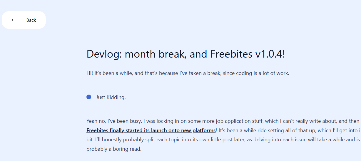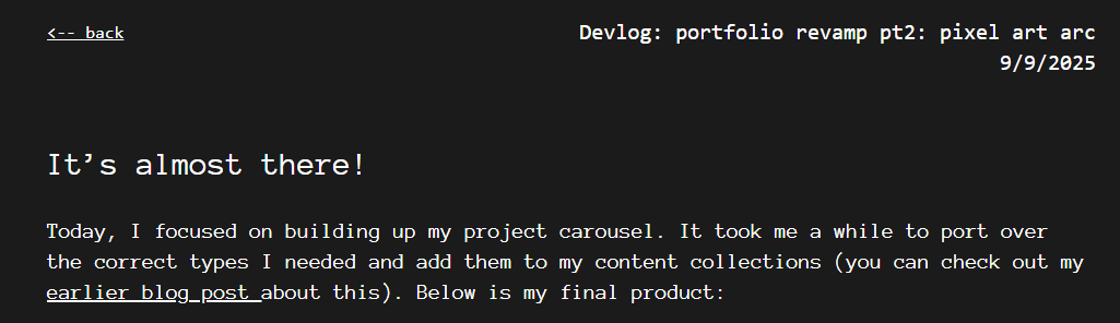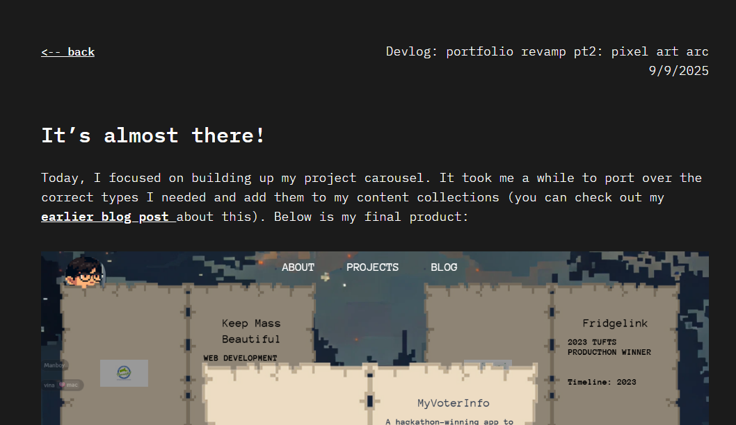 This is the big release! I was gonna call it v1.0.0 but it’s genuinely just not done yet…the about section doesn’t work, but I think it looks presentable right now, so I wanted to release it to motivate myself to keep working on the portfolio. Today, I cleaned up some logic with smooth scrolling and the page transitions. I also ported over the project/blog details, which has a more updated look now: